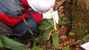野幌森林公園において継続実施しているサルメンエビネ生育状況調査を、道総研環境科学センターの学識者と実施しました。