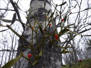 収穫調査で山を歩いていると、ヤマナラシからヤドリギ(アカミヤドリギ)が生えていました。
