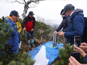 北海道大分水点の提唱者である野尻拓己氏をはじめ三市町及び関係者の総勢25名が2時間かけて登山し、無事、除幕式を終えることができました。