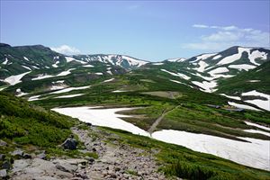 黒岳の頂上から黒岳石室に向かうと、北鎮岳、中岳、間宮岳などの2,000メートル級の山々に囲まれた御鉢平があり、この時期は残雪がハイマツ等と重なりゼブラ模様となっています。
