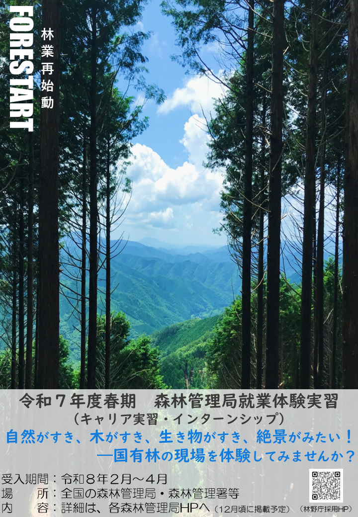 林野庁では、就業体験を通して学生の高い職業意識を育成するとともに、国有林野事業及び林野行政に対する理解を深めてもらうことを目的として、
