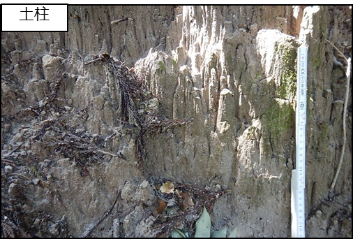 土壌侵食痕の一つで、小石、地表の根、枝葉の下の土層が雨滴侵食から保護され柱状に残ったもので、高さ2cm以上のものを「土柱」という。