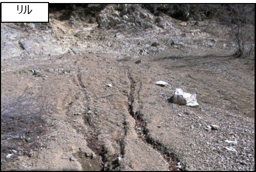 土壌侵食痕の一つで、地表の流水による溝状の侵食で深さ30cm未満のもの(沢の源頭部など、地形的に集水するものは除く)を「リル」といい、