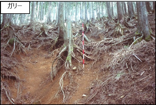 土壌侵食は、樹木がなかったり、亜高山性の針葉樹が優占している森林など、主として脆弱な地質構造を持った山岳地帯に分布する森林内にみられます。