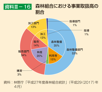 森林組合は、「森林組合法(*19)」に基づく森林所有者の協同組織で、組合員である森林所有者に対する経営指導、森林施業の受託、林産物の生産、販売、加工等を行っている(資料 III -16)。