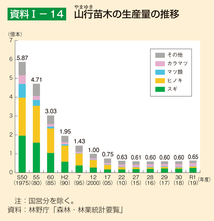 我が国における山行(やまゆき)苗木(*40)の生産量は、平成25(2013)年の約56百万本を底に増加に転じており、令和元(2019)年度は約65百万本となっているが、このうち約3割をコンテナ苗(*41)が占めるようになるなど、今後の森林施業の在り方を見据えた苗木の安定供給が進められている(資料1-14)。