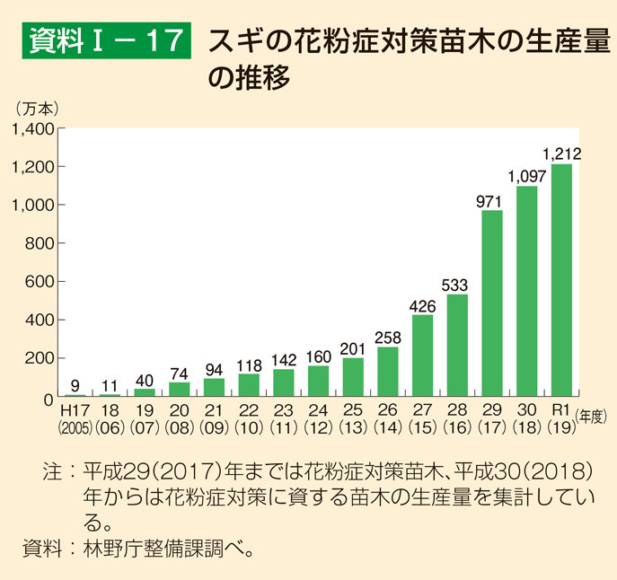 林野庁では、(ア)花粉を飛散させるスギ人工林等の伐採・利用、(イ)花粉症対策に資する苗木(*48)による植替えや広葉樹の導入、(ウ)スギ花粉の発生を抑える技術の実用化の「3本の“斧”」による花粉発生源対策に取り組んできている。