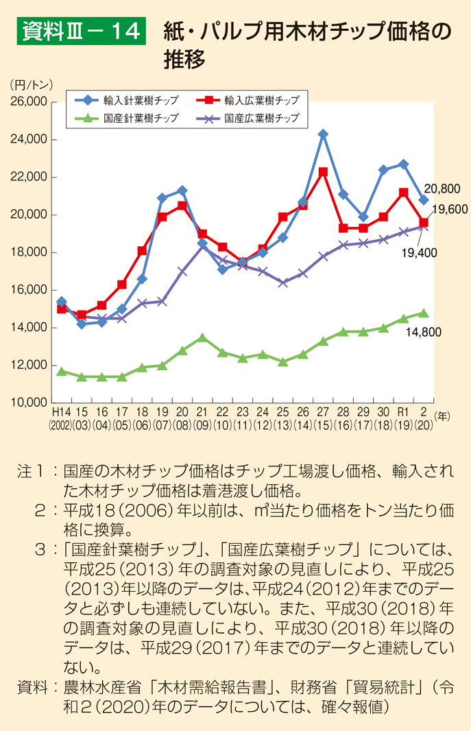 また、輸入された木材チップの価格は、リーマンショック及び為替変動等の影響を受けて下落と上昇を繰り返しながら、長期的には上昇傾向にあったが、令和2(2020)年は下落し、輸入針葉樹チップの価格は20,800円/トン(前年比1,900円/トン安)、輸入広葉樹チップの価格は19,600円/トン(前年比1,600円/トン安)であった(資料3-14)。