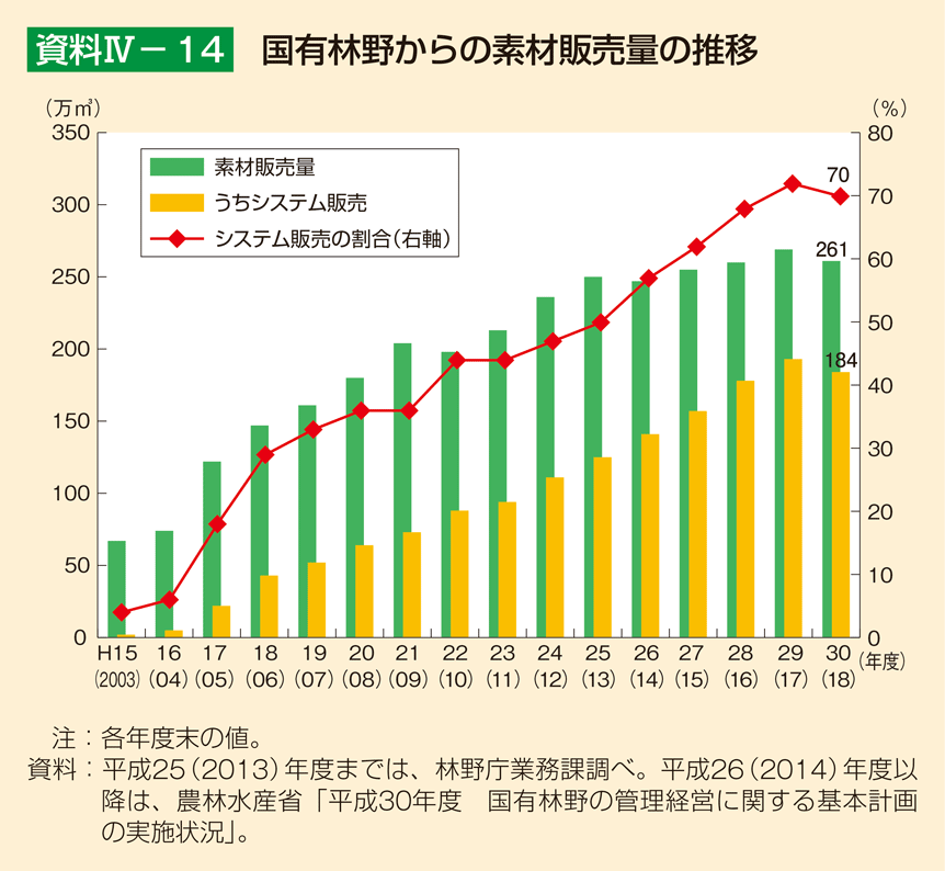 国有林野事業からの木材の供給に当たっては、集成材・合板工場や製材工場等と協定を締結し、林業事業体の計画的な実行体制の構築に資する国有林材を安定的に供給する「システム販売」を進めている(事例4-9)。システム販売による丸太の販売量は増加傾向で推移しており、平成30(2018)年度には丸太の販売量全体の70%に当たる184万m3となった(資料4-14)。また、システム販売の実施に当たっては、民有林所有者等との連携による協調出荷に取り組むとともに、新規需要の開拓に向けて、燃料用チップ等を用途とする未利用間伐材等の安定供給にも取り組んでいる。