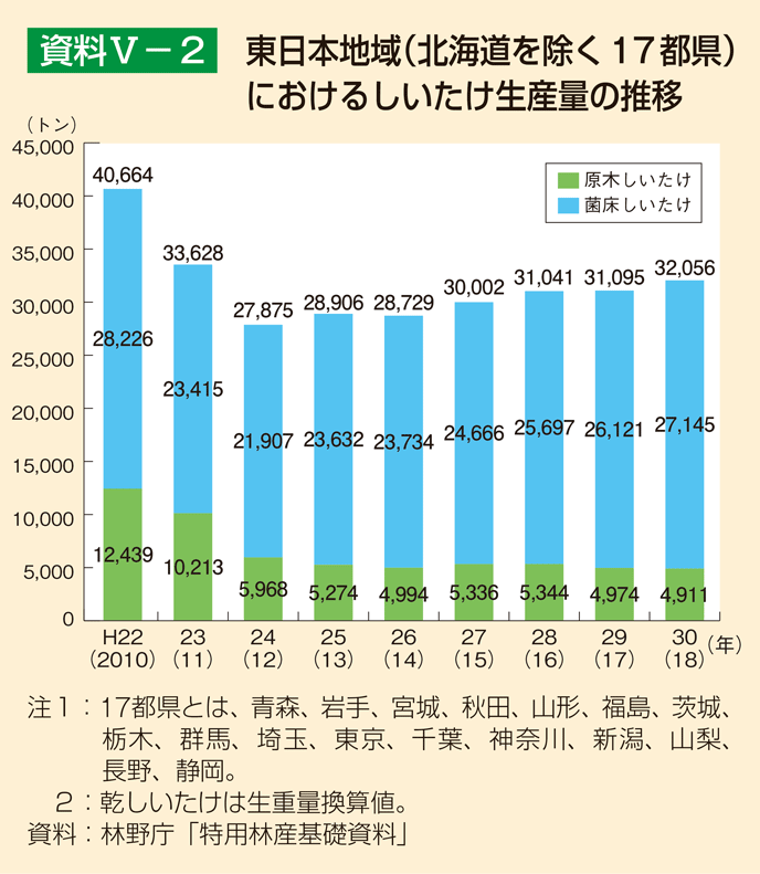また、東京電力福島第一原子力発電所の事故に伴う放射性物質の影響により、東日本地域では原木調達が困難になるなど、しいたけ等の生産体制に大きな被害を受けた。