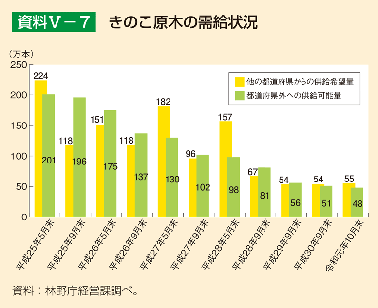 きのこ原木の需給状況については、平成25(2013)年9月以降は、森林所有者等によるきのこ原木の供給可能量がきのこ生産者等によるきのこ原木の供給希望量を上回る状況が多くなっており(資料5-7)、きのこ原木のマッチングが進んでいると考えられるが、令和元(2019)年10月末時点で、供給希望量55万本のうちコナラが約9割を占めている一方、供給可能量48万本のうち約8割がクヌギ等となっており、樹種別にみるとミスマッチが生じている状況にある。