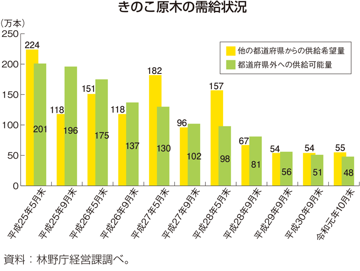 ➢ 福島県産を始めとするきのこ原木の減少に対応し、原木の安定供給に向けて需給のマッチング等を推進
