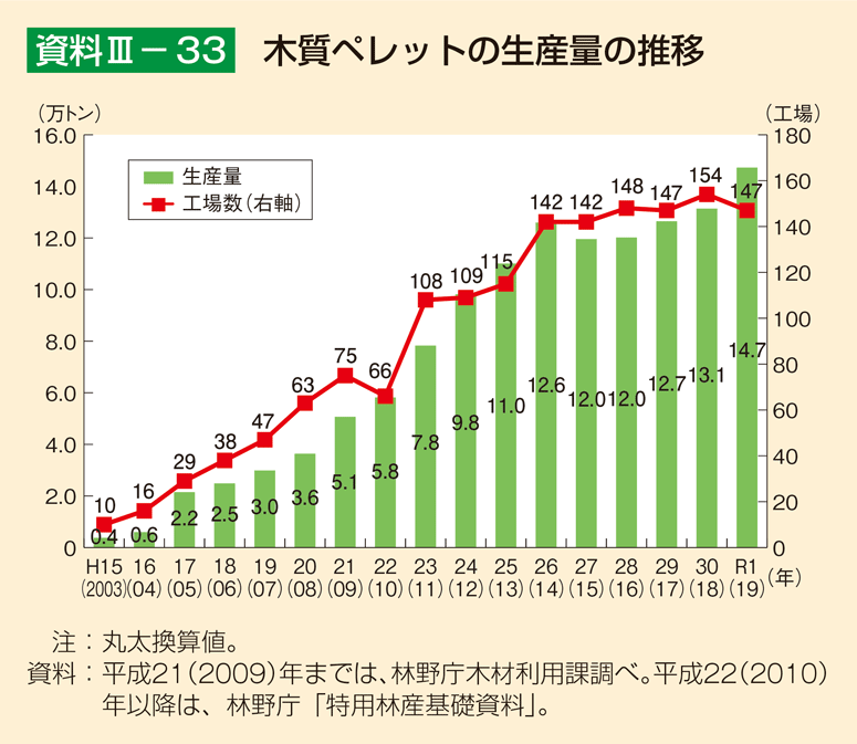地球温暖化等の環境問題への関心の高まり等もあり、木質ペレットの国内生産量は増加傾向で推移してきた。令和元(2019)年については前年比12%増の14.7万トン、工場数は前年から7工場減の147工場となっている(*115)(資料3-33)。これに対して、令和元(2019)年の木質ペレットの輸入量は、前年比52%増の161万トンであった(*116)。