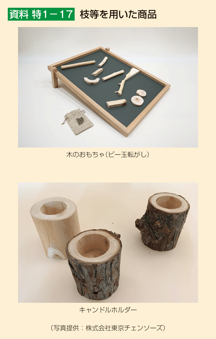 また、商品を開発し、新しい需要を開拓している林業経営体も存在する。例えば、株式会社東京チェンソーズ(東京都檜原村(ひのはらむら))は、1本の木の価値を最大化するため、製材として使えない部分も含めて樹木を丸ごと使うことを目指し、様々な商品を開発し販売している。例えば製材としては使えない枝や梢の部分も、おもちゃや雑貨等での販売や商業施設等でのディスプレイでの活用をしている(資料 特1-17)。