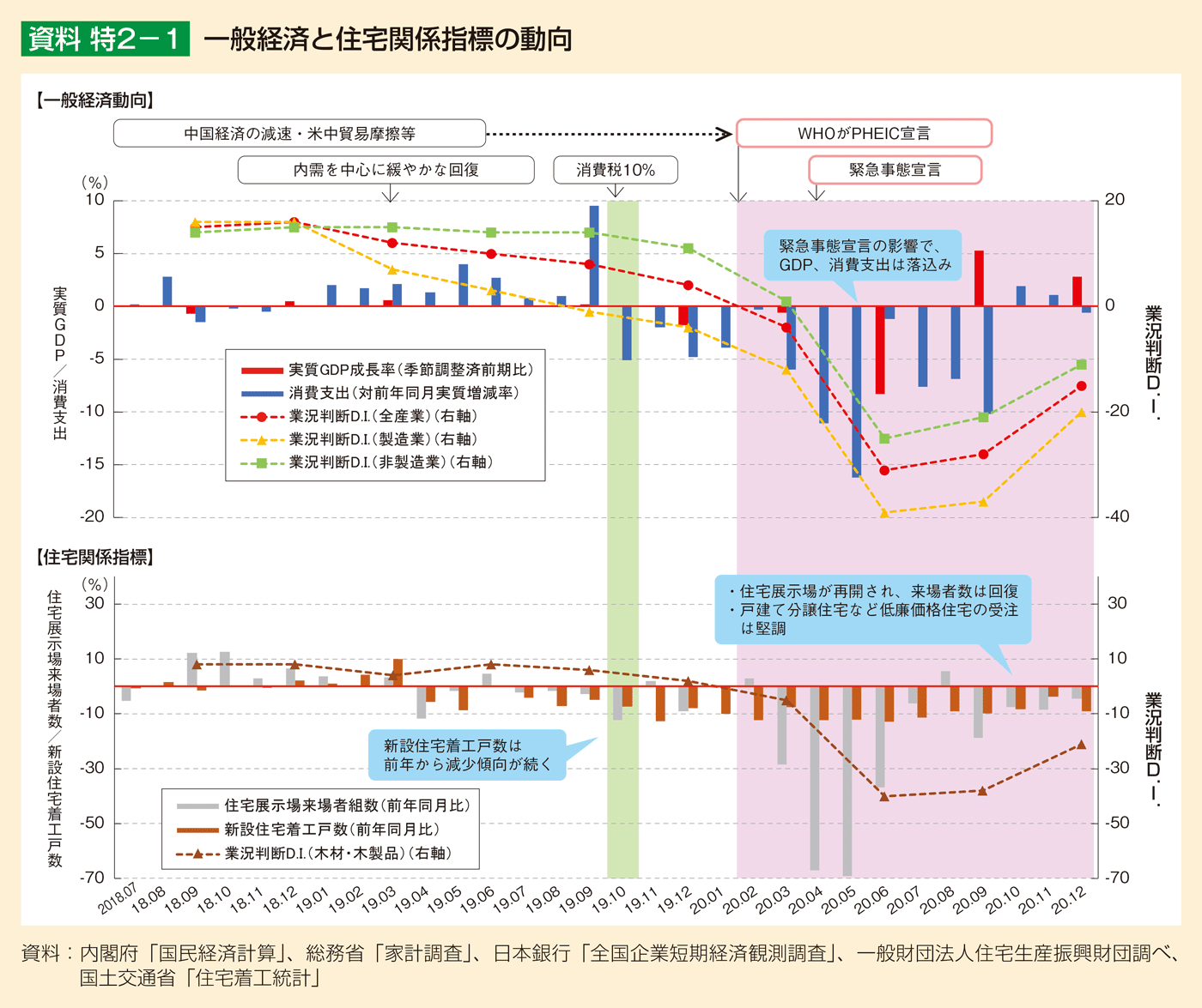 令和2(2020)年1月以降、低調に推移していた我が国の製造業業況判断D.I.(*1)は、3月以降の世界的な新型コロナウイルス感染症拡大の影響を受け、急速に落ち込んだが、6月を底に徐々に回復がみられている。我が国の個人消費支出についても、3月から5月にかけて大きく落ち込んだ後、徐々に回復がみられる(資料 特2-1)。しかし、令和3(2021)年にかけても、感染が収束しない状況が続いており、我が国経済への影響の長期化が懸念されている。