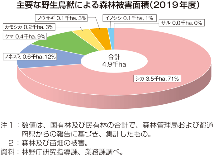 ➢ 野生鳥獣による森林被害は依然として深刻であり、2019年度には約4,900haで被害が発生し、約7割がシカによる被害