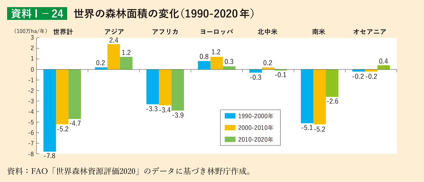 国際連合食糧農業機関(FAO(*81))の「世界森林資源評価2020」によると、2020年の世界の森林面積は約41億haであり、世界の陸地面積の31%を占めている(*82)。森林面積は、アフリカ、南米等の熱帯林を中心に世界全体としては依然として減り続けている(資料1-24)。