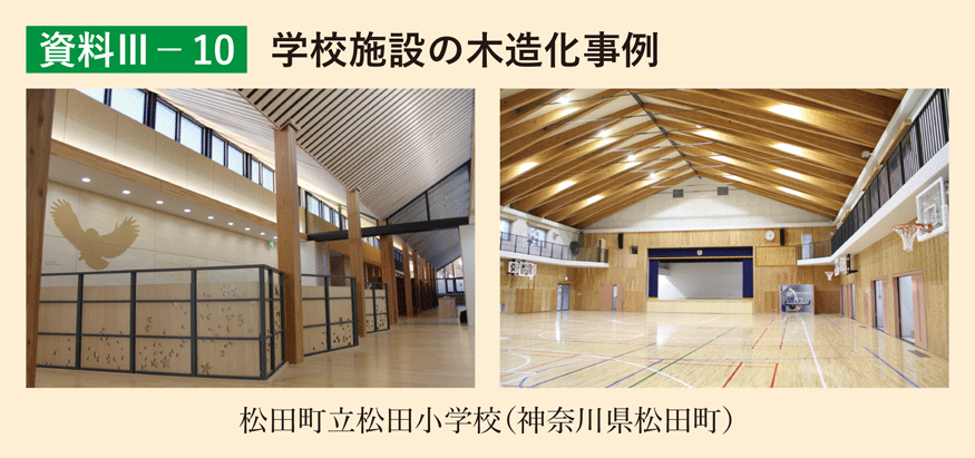 このため、文部科学省では、学校施設の木造化や内装の木質化を進めており、令和2(2020)年度に新しく建設された公立学校施設の19.1%が木造で整備され、非木造の公立学校施設の67.7%(全公立学校施設の54.8%)で内装の木質化が行われたことから、公立学校施設の73.9%で木材が利用された(*58)。さらに、文部科学省、農林水産省、国土交通省及び環境省が連携して行っている「エコスクール・プラス(*59)」において、農林水産省では、内装の木質化等を行う場合に積極的に支援することとしている(資料3-10)。