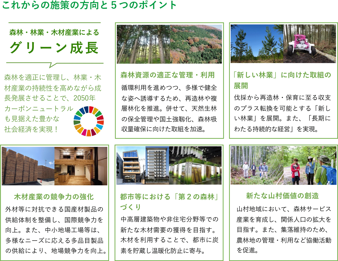 こうした課題等を踏まえ、令和3(2021)年6月に閣議決定された新たな森林・林業基本計画では、新技術を活用して伐採から再造林・保育に至る収支のプラス転換を可能とする「新しい林業」の展開や、木材産業の競争力の強化、都市等の建築物における新たな木材需要の獲得などに取り組むこととしており、再造林等により森林の適正な管理を図りながら、森林資源の持続的な利用を一層推進して引き続き成長産業化に取り組むことにより、2050年カーボンニュートラルに寄与する「グリーン成長」を実現していくこととしています。