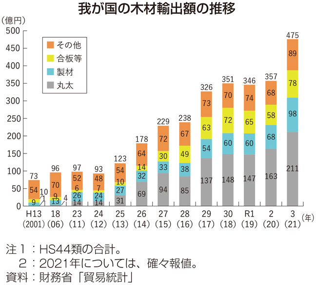 ➢ 木材輸出額は増加傾向であり、2021年は前年比33%増の475億円