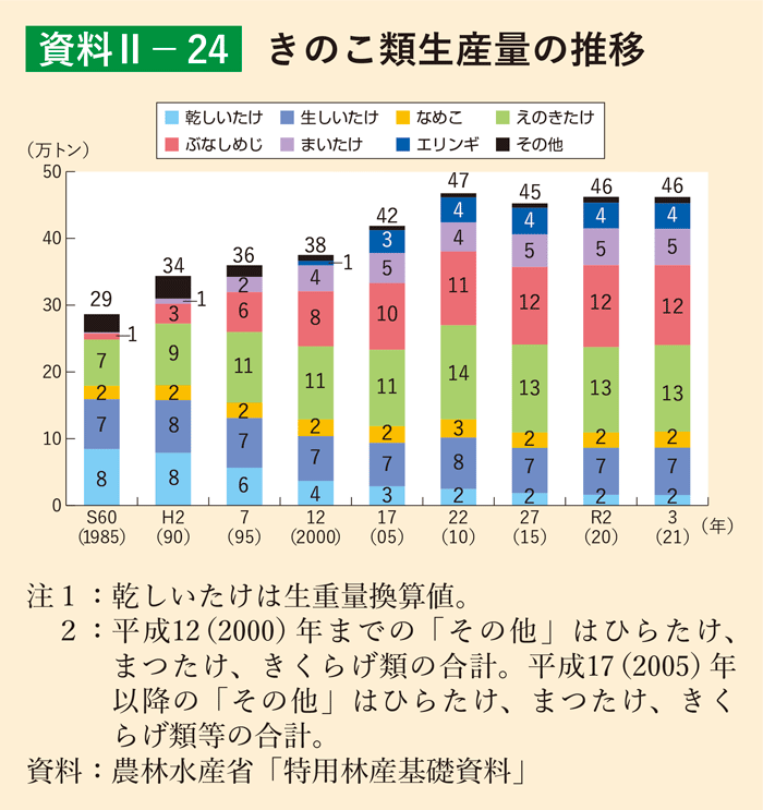 きのこ類の生産量については、「食料・農業・農村基本計画」(令和2(2020)年3月閣議決定)において、令和12(2030)年度までに49万トンとする生産努力目標を設定しているが、近年46万トン前後で推移している。令和3(2021)年の生産量はほぼ横ばいの46.2万トンとなった(資料2-24)。また、原木しいたけ生産者戸数は減少傾向、菌床きのこ等生産者戸数は横ばいで推移している(*59)。