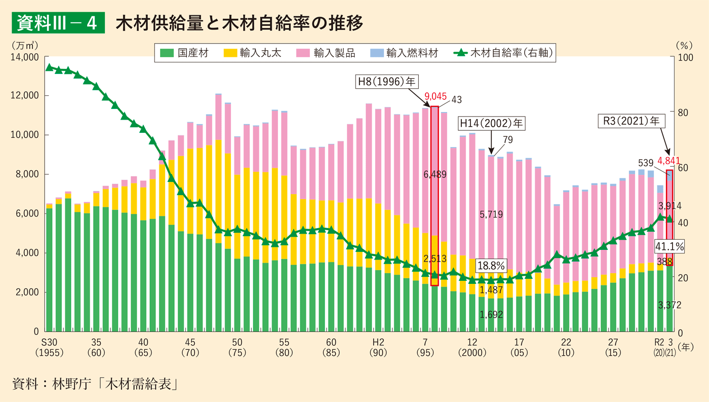 (木材自給率は4割を維持)