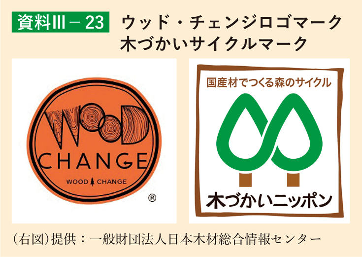 また、「木づかいサイクルマーク」(資料3-23)は、パンフレット等による広報活動や国産材を使用した製品への添付等により木材利用をPRするもので、令和5(2023)年3月末現在、383の企業や団体で使用されている。