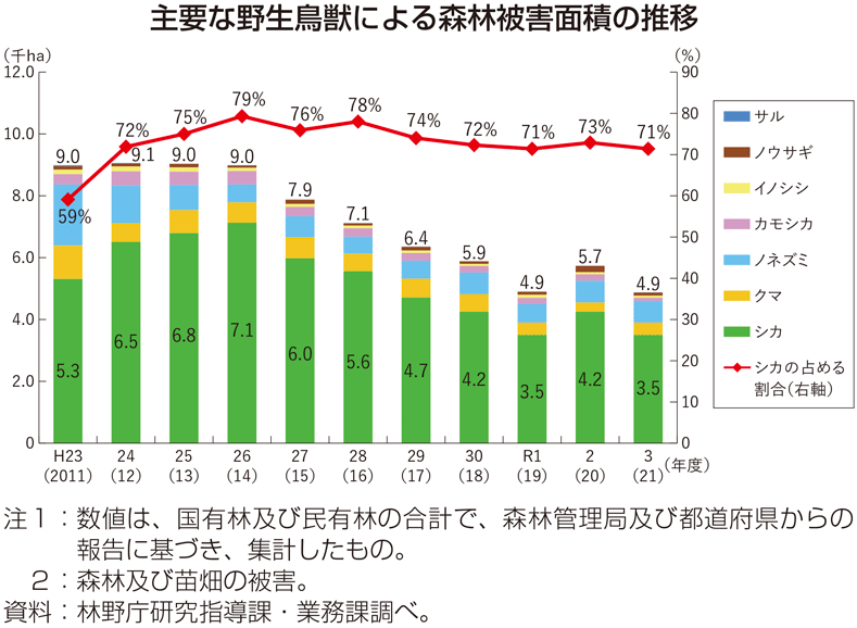 ➢ 防護柵の設置等による植栽木の防護、捕獲等の対策を総合的に推進。2021年度は約72.5万頭(前年比7.4%増)のシカを捕獲したが、2023年度までの半減目標達成に向けて、引き続き捕獲強化が必要