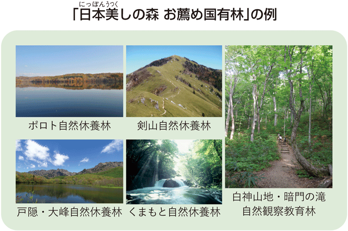 ➢ 我が国の世界自然遺産(「知床(しれとこ)」、「白神山地(しらかみさんち)」、 「小笠原諸島(おがさわらしょとう)」、「屋久島(やくしま)」、「奄美大島(あまみおおしま)、徳之島(とくのしま)、沖縄島北部(おきなわじまほくぶ)及び西表島(いりおもてじま)」)の陸域の86%は国有林野