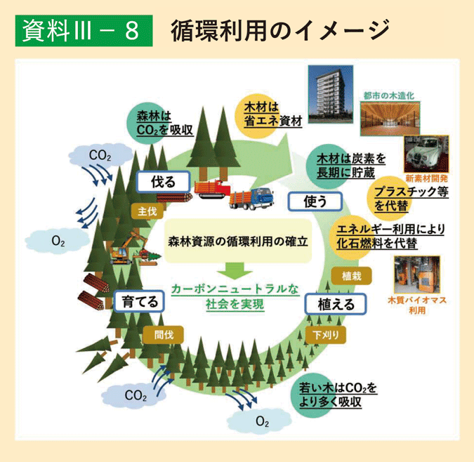 このように様々な特徴を持つ木材を持続的に利用しカーボンニュートラルな社会の実現を目指していくに当たっては、森林資源の循環利用を確立することが重要である(資料3-8)。