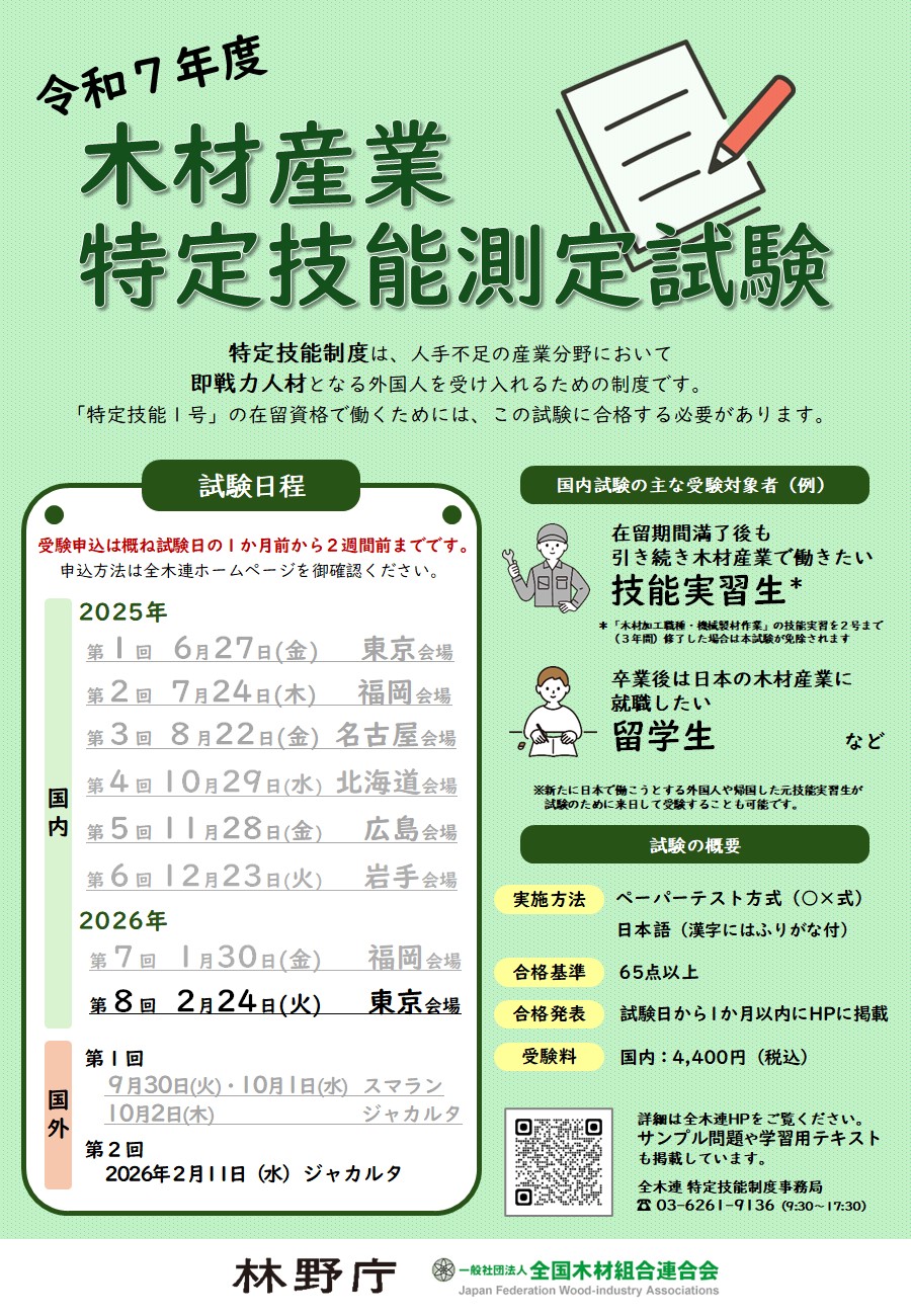 - 令和7年度木材産業特定技能測定試験(リーフレット)(2026年2月)(PDF : 722KB)