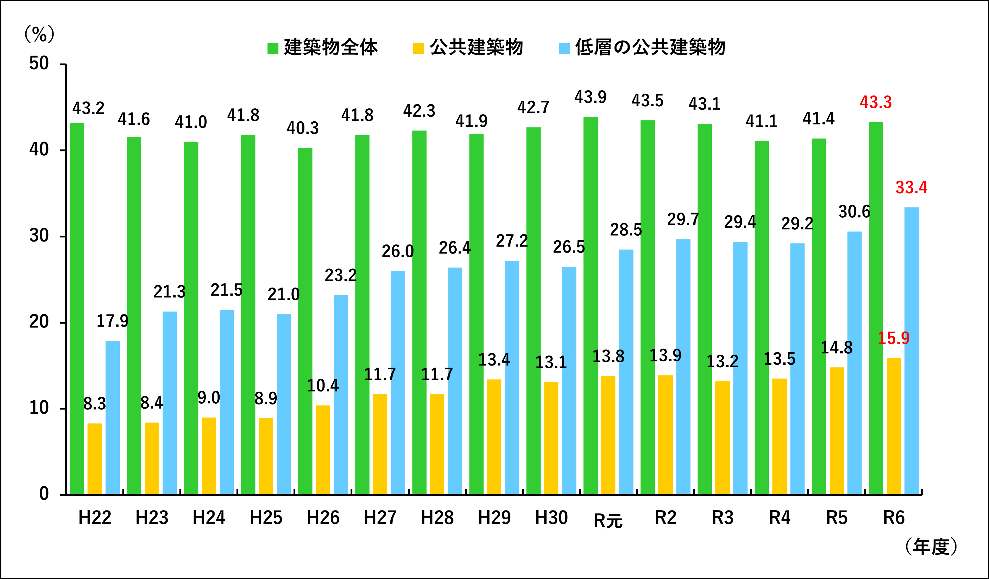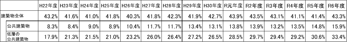 平成22年に「公共建築物等における木材の利用の促進に関する法律」が施行されて以降、公共建築物の木造化の進捗状況を捉えるため、国土交通省「建築着工統計」を活用し、年度毎の公共建築物の木造率(床面積ベース)を試算し、公表しています。令和6年度の試算結果