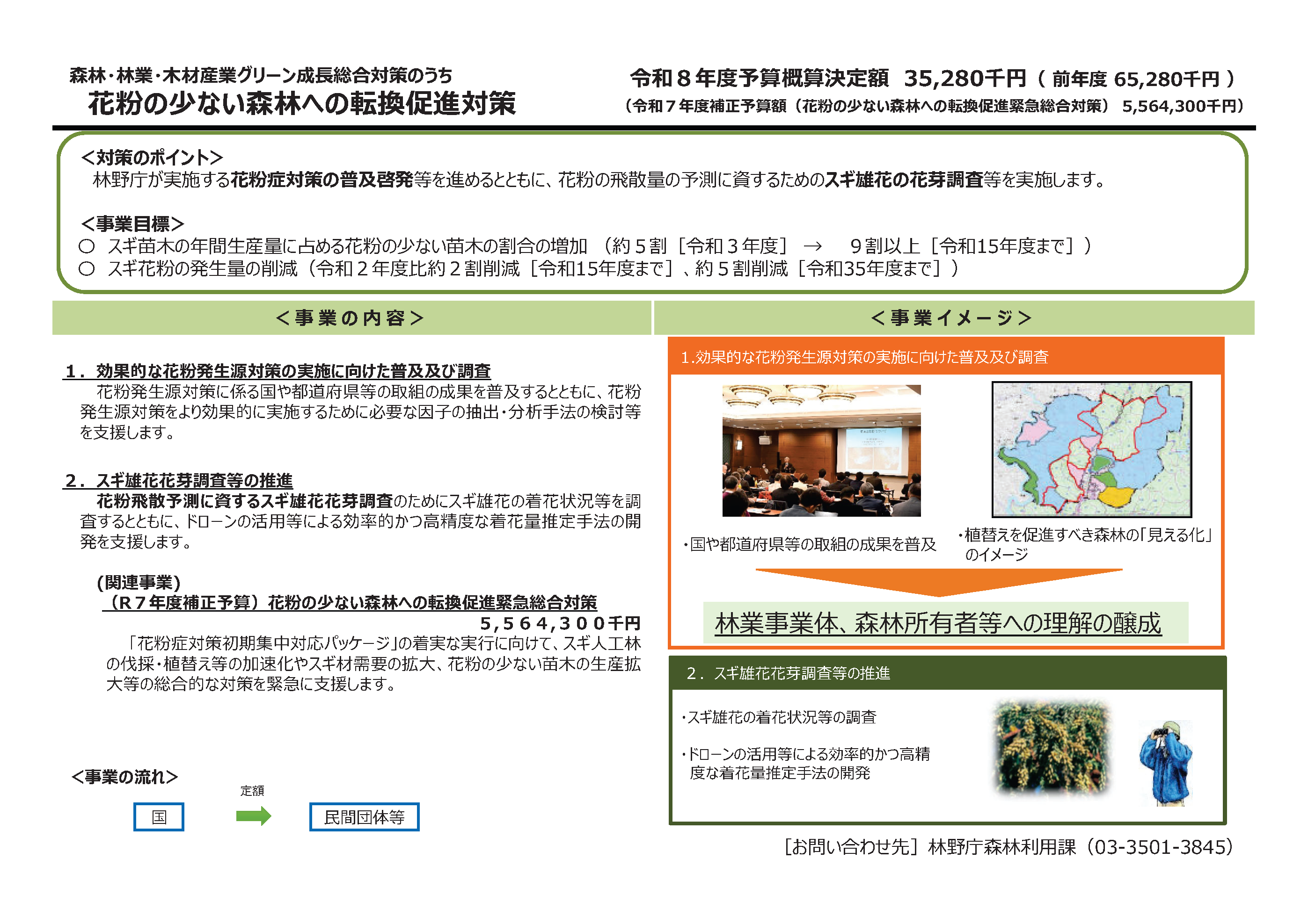 令和7年度補正予算の「1.花粉の少ない森林への転換促進緊急総合対策」「スギ人工林の伐採・植替え等の加速化」において、「花粉の少ない森林への転換促進事業」を措置しています。