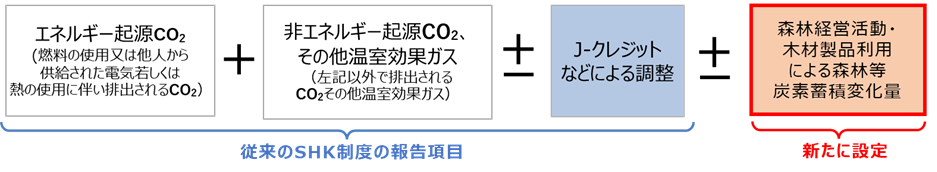 SHK制度では、自社における排出量を基礎排出量として報告するとともに、J-クレジットなどにより任意で調整を行った後の排出量を、調整後排出量として報告しなければなりません。今般の見直しにより、事業者自らの森林経営活動や木材製品利用による炭素蓄積変化量として、「森林等炭素蓄積変化量」を新設し、任意で調整後排出量の算定に用いることができるようになりました。令和8年4月1日に改正後の制度が施行され、事業者向けの算定・報告マニュアルや算定シートが公表されました。令和8年度排出量実績に関する令和9年度報告から適用されます。