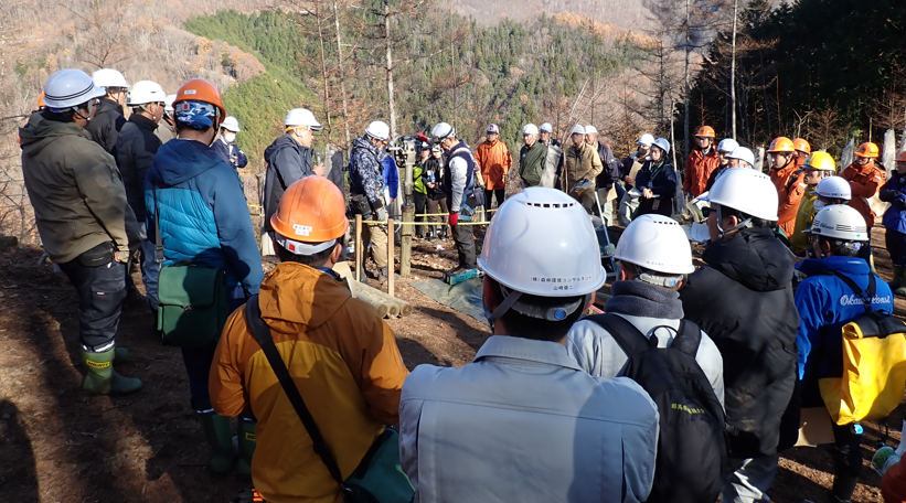 ぐんまフォレスター連絡会は、このたび、群馬森林管理署と協力し、この新工法をテーマとした現地検討会を企画・実施しました。この共催によって当日は、国有林野事業の森林土木(治山・林道)工事受注者のみならず、幅広く県内の林業関係者にもご参加いただきました。