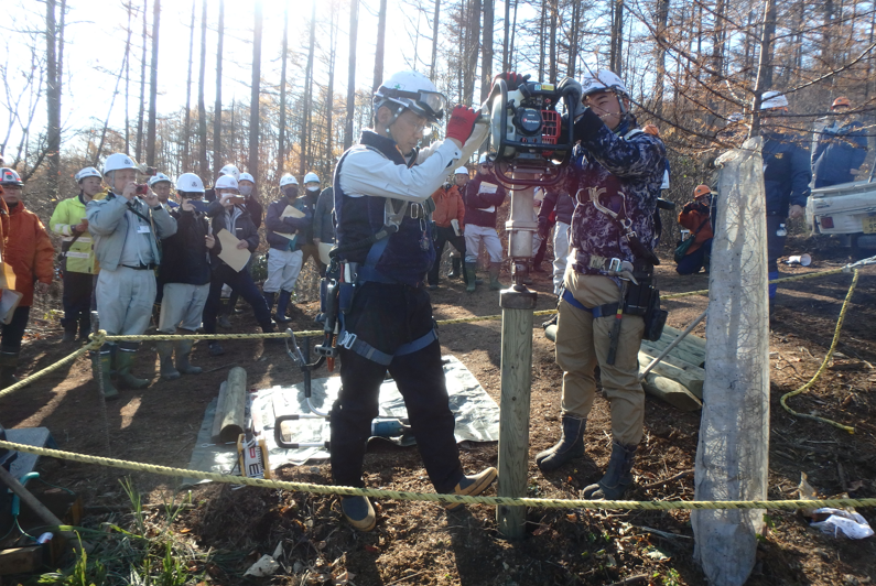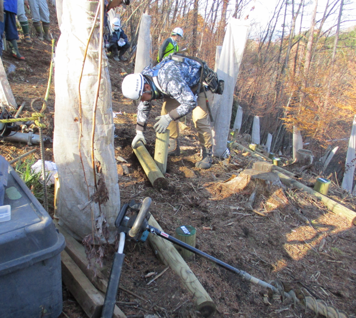 群馬森林管理署では、御荷鉾スーパー林道(※※)に土砂が流出した山腹崩壊の緊急治山工事として、「木杭根系工法」を採用しています。検討会では、この事業現場を会場とし、参加者には、山腹斜面(造林地)への施工状況のほか、工事受注者が木杭を打設し、羽根木を設置するまでの作業工程の実演を確認していただきました。