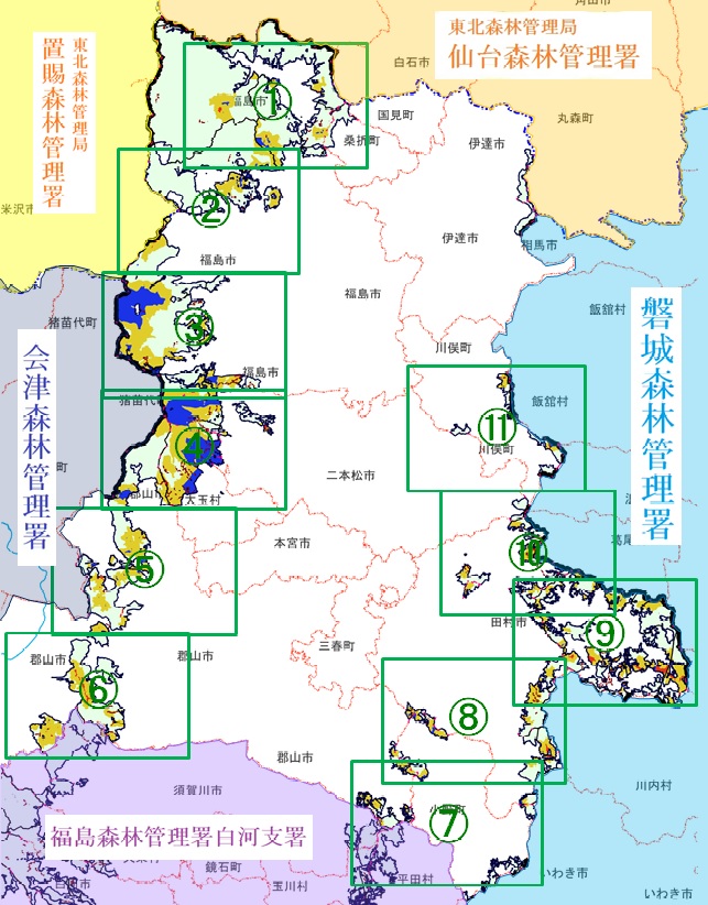 福島森林管理署管内の鳥獣捕獲目的立入禁止区域図(下図)をご確認の上、該当する地図番号を選んでください。