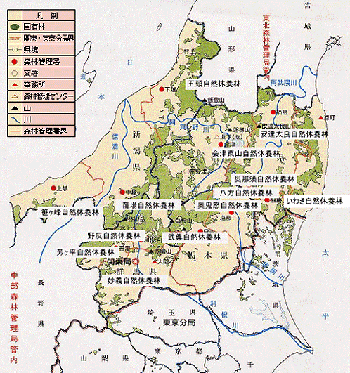 自然休養林位置図 各自然休養林のロゴをクリックすると詳細が見られます