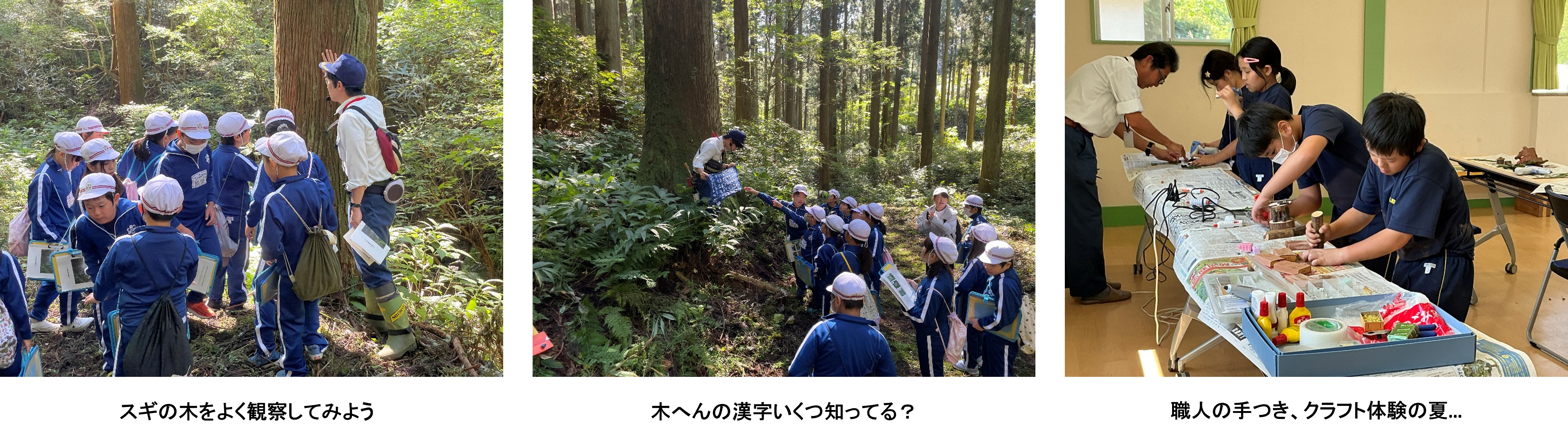 林内を五感で楽しむ植物の紹介からはじまり、自然現象、林業までスケールアップする解説、巨大なスギの測定、ドローンのデモ飛行を行いました。フィールドワーク終了後は、学校へ戻り、磐城署職員が用意したスギの円盤、ドングリや松ぼっくり等の自然の素材を組み合わせ、思い思いの作品をクラフトする体験を実施しました。