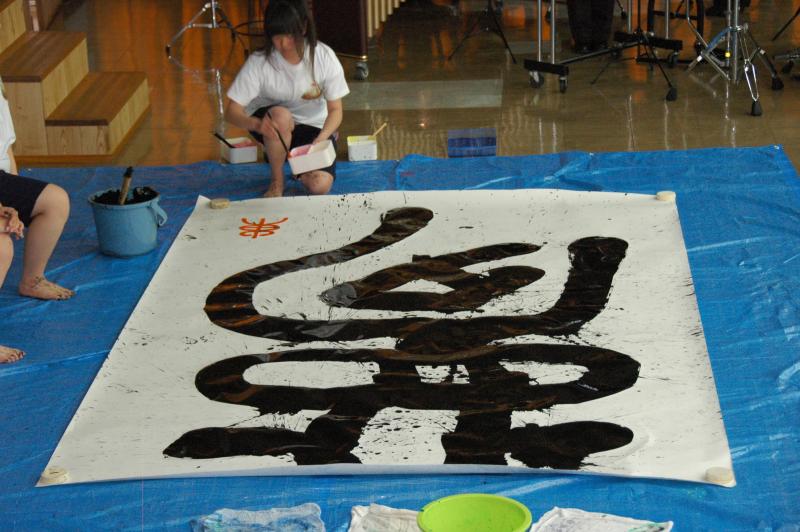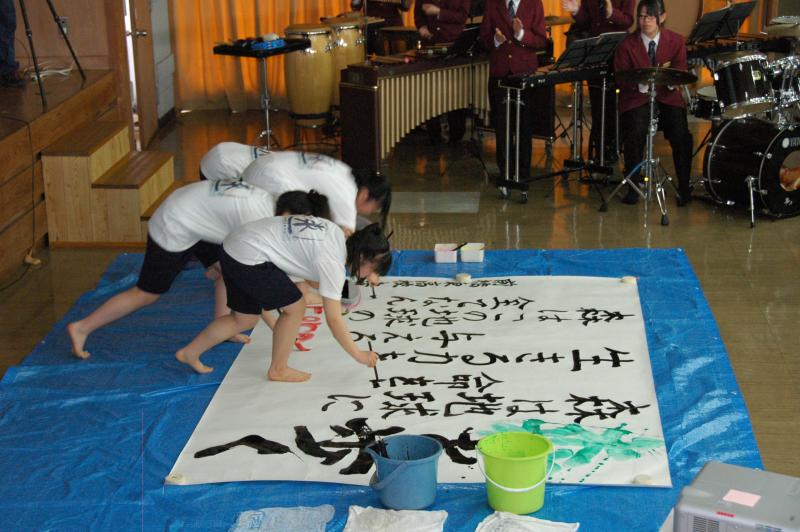 初めて目の前で見る「書道パフォーマンス」に感動!動画でお見せできないのが残念です。 自分達の「足」を使って表現した「森を歩く」。 被災された皆さんへのメッセージは「夢」。「夢」を持って欲しいとの願いが込められました。