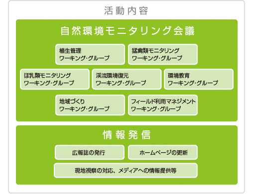プロジェクトの活動は、自然環境モニタリング会議が各ワーキンググループを統括し実施しています。詳しくは、Contents活動内容をご覧ください。