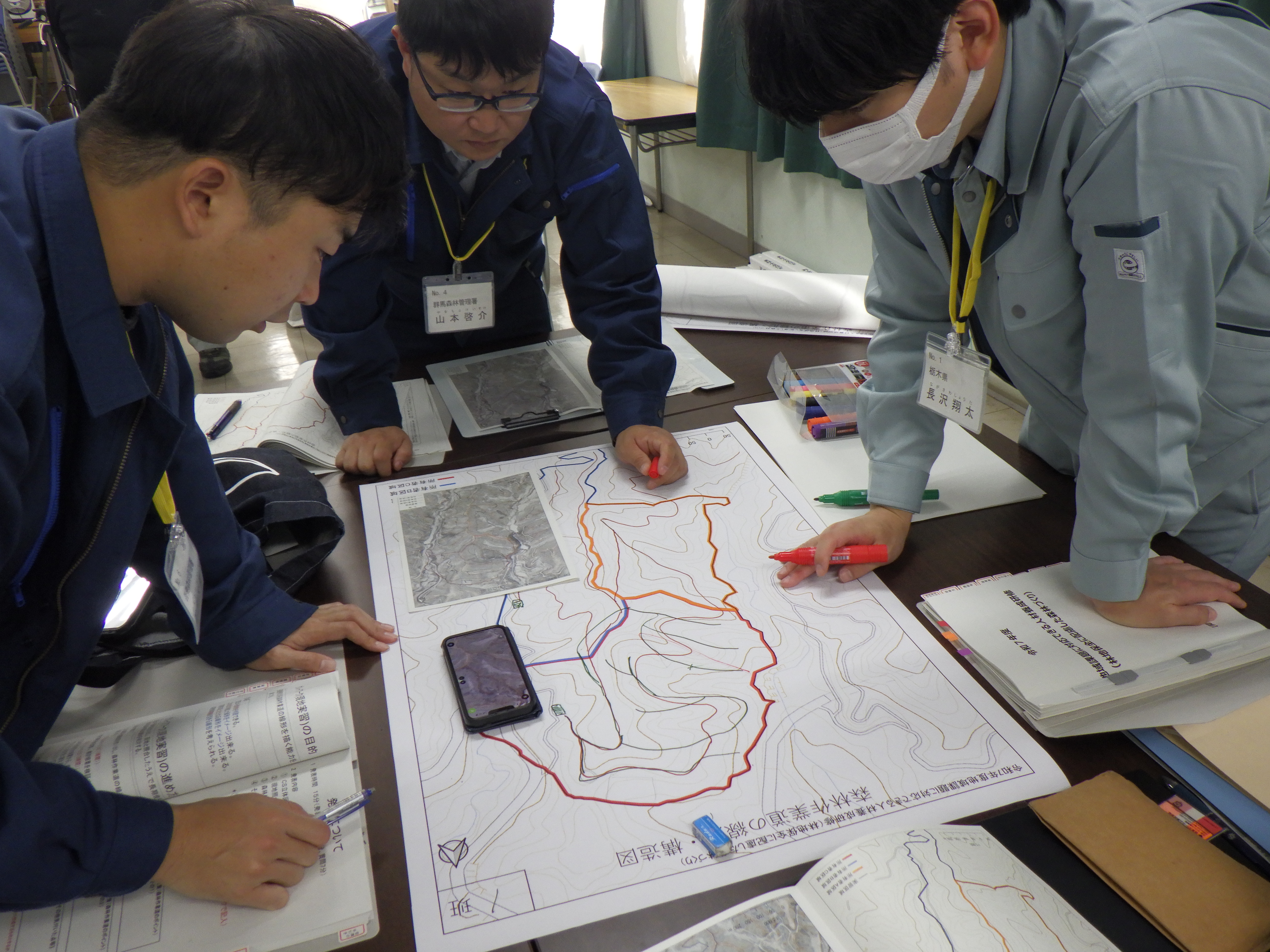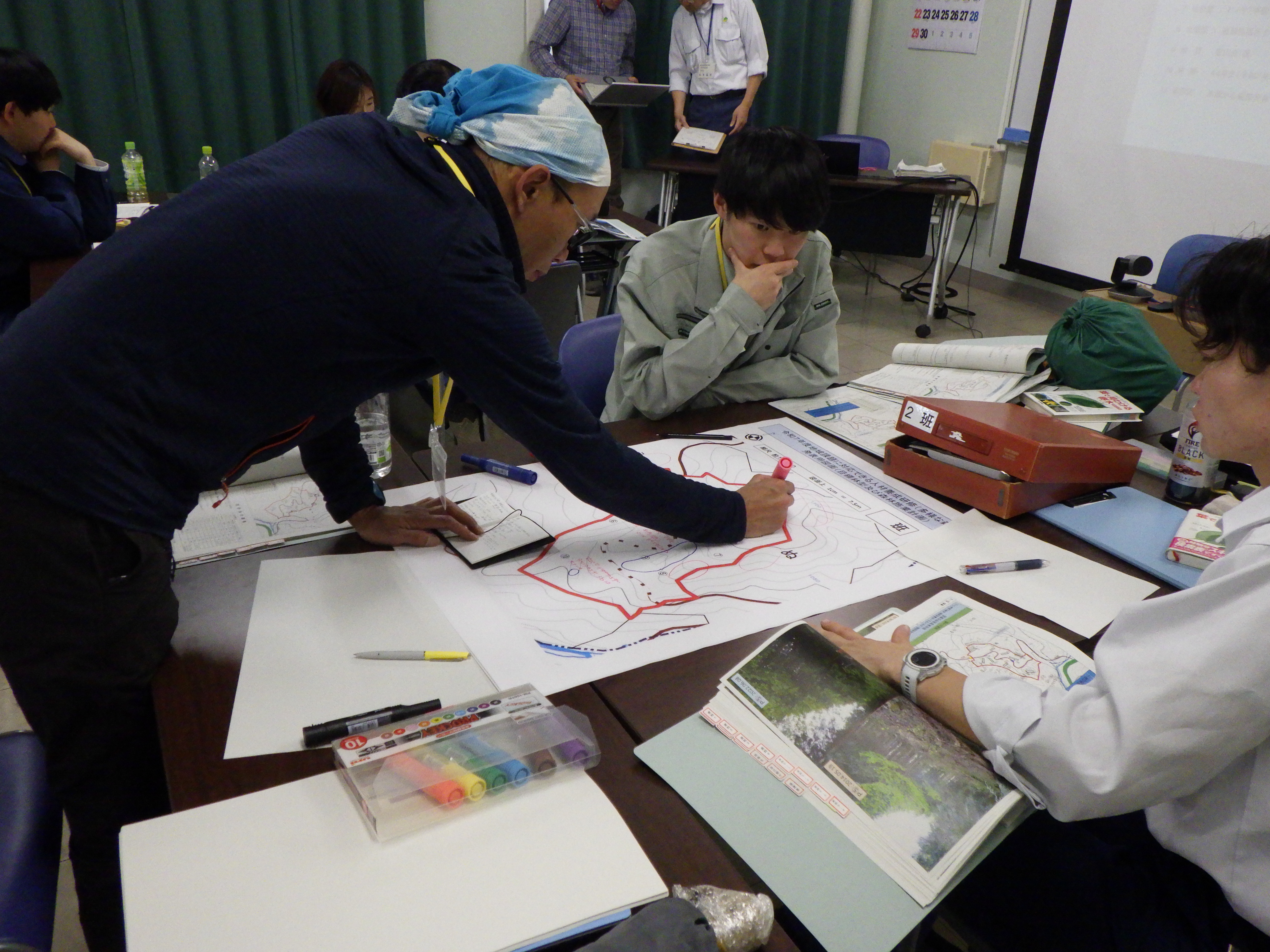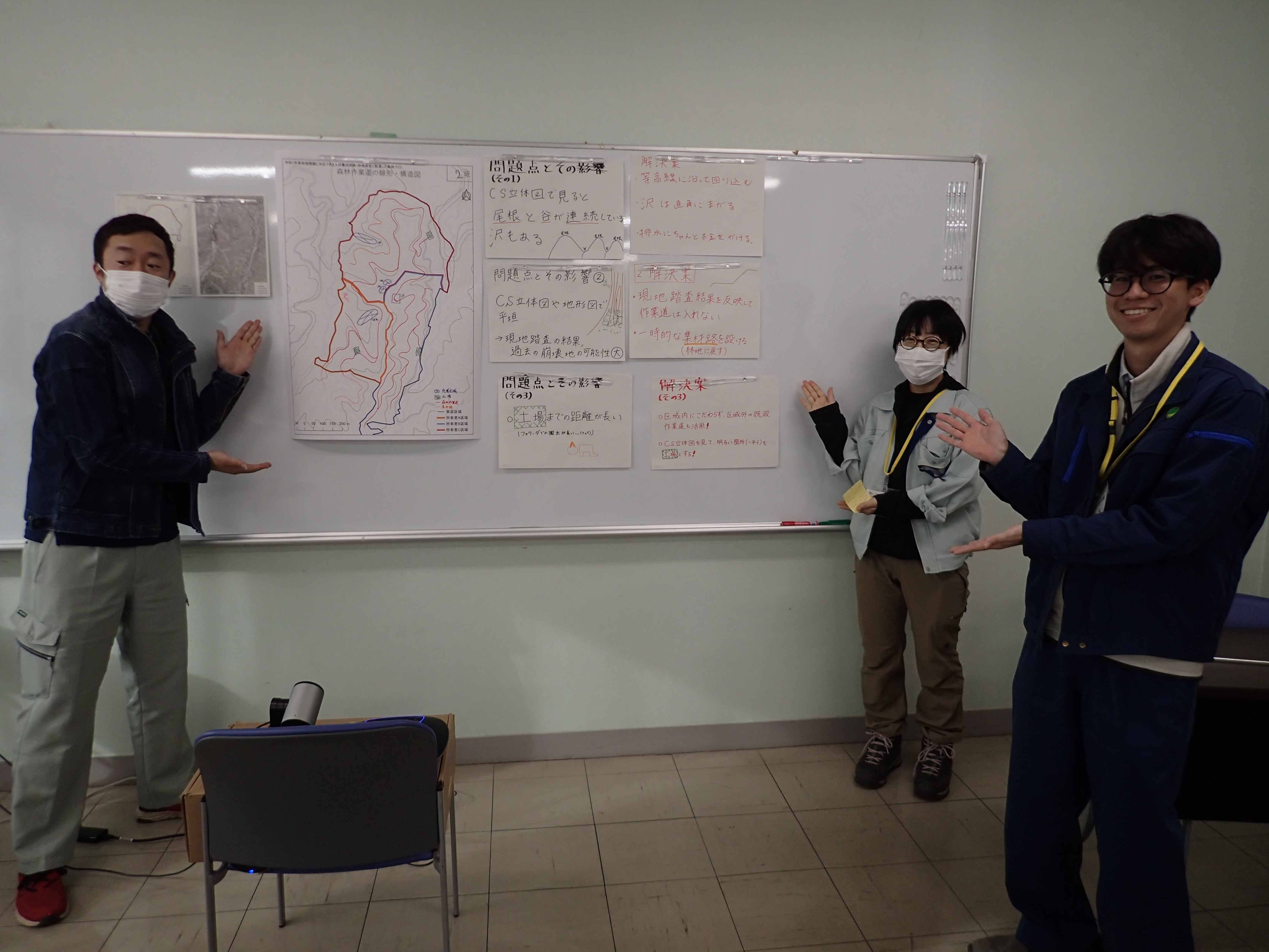 - 3日目:グループ毎に検討した森林作業道の線形を書き入れ発表。
