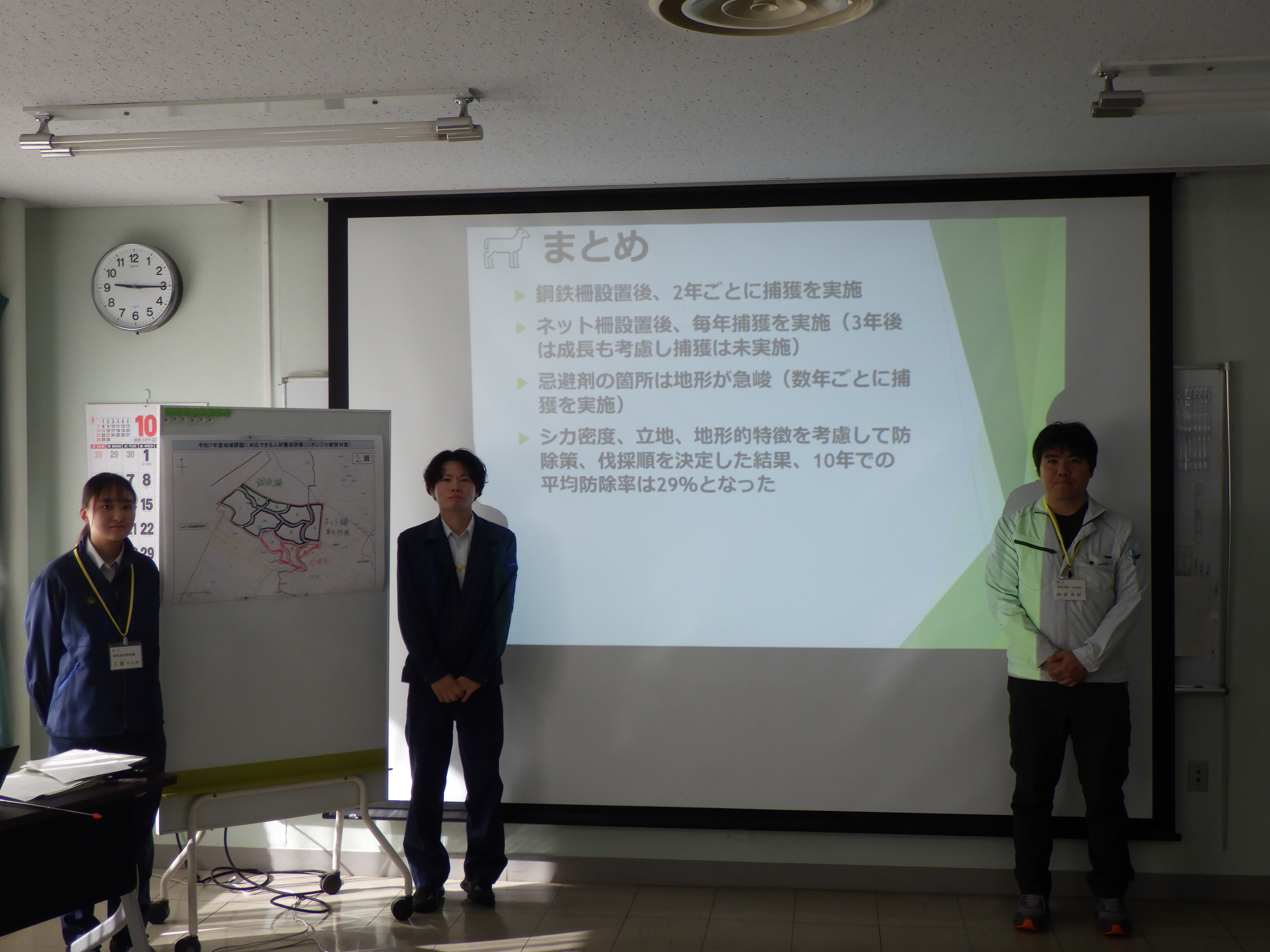 - 3日目:グループ毎に区画分けされた実習地において、主伐再造林を行った場合の二ホンジカ被害対策をシミュレーションし発表。