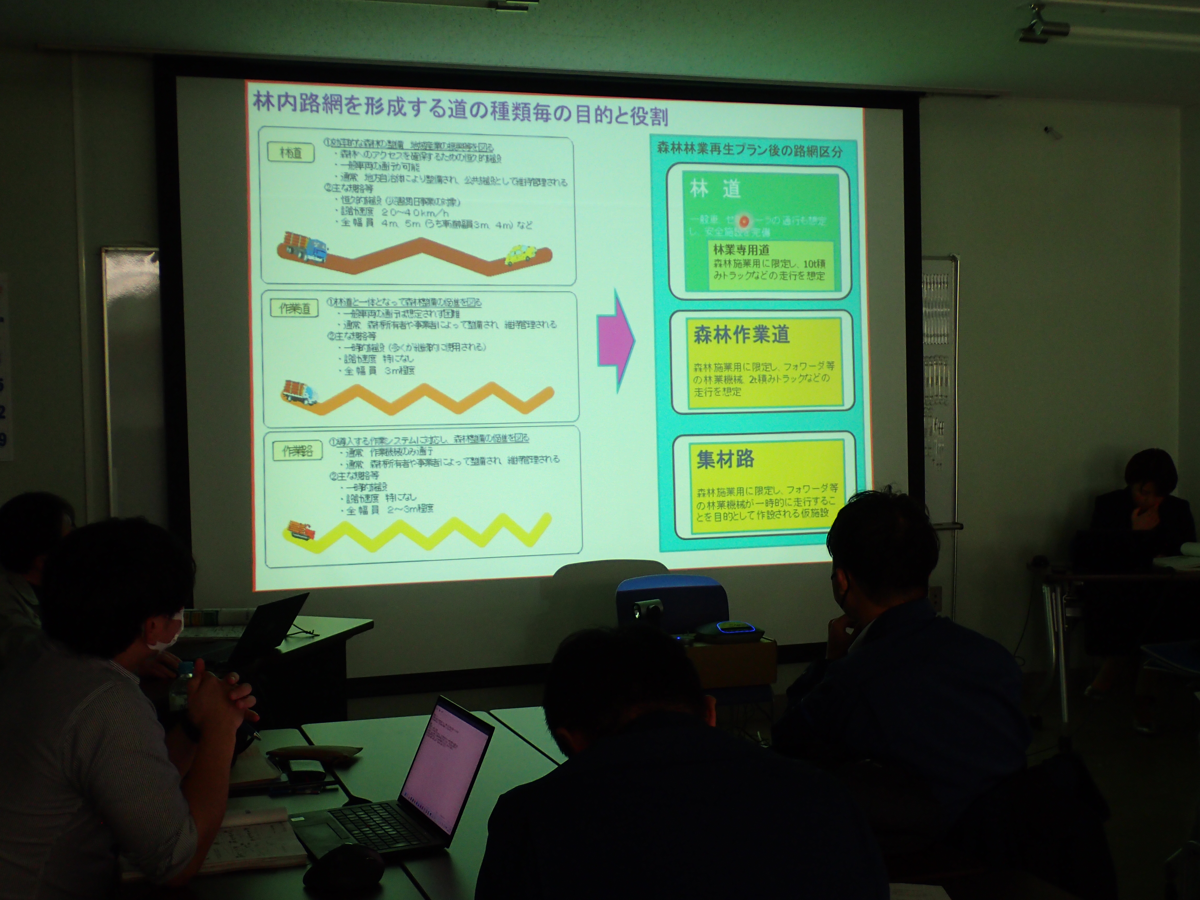 - 1日目:講義により地形判読の基礎、CS立体図やQGISを路線選定に活かした事例、耐久性のある森林作業道やその路線計画等について学ぶ。