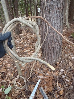 1.リースの元となる「つる」を採取します。造林木に絡まっているつるは、実は木を