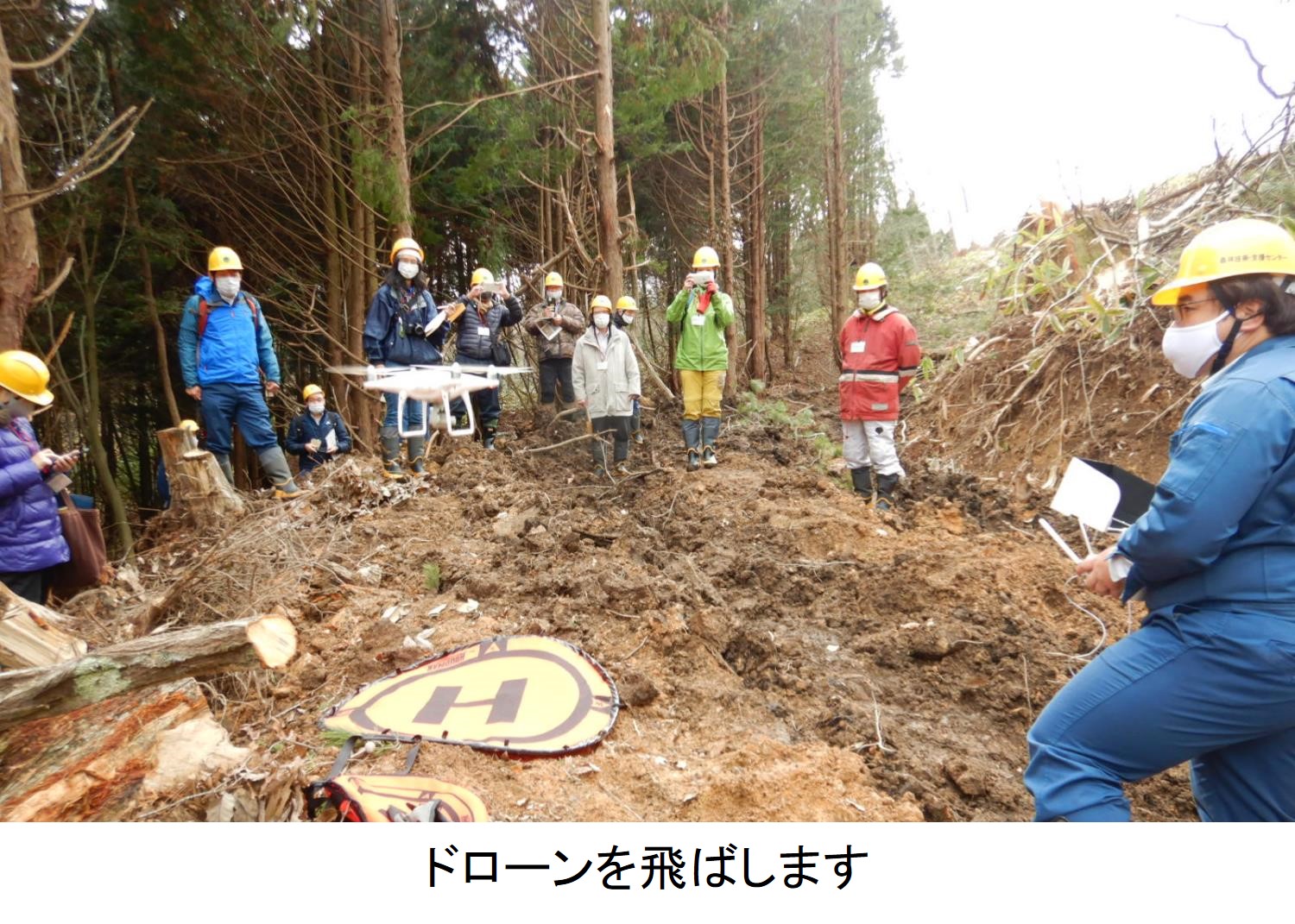 最初に、先進機器を用いた森林調査や森林計測の技術を説明しました。次に地上レーザースキャナによる立木調査を実演し、参加者の皆様にも実際に計測体験をしていただきました。また、ドローンのデモ飛行を行い、上空から見た国有林の事業地を確認していただきました。