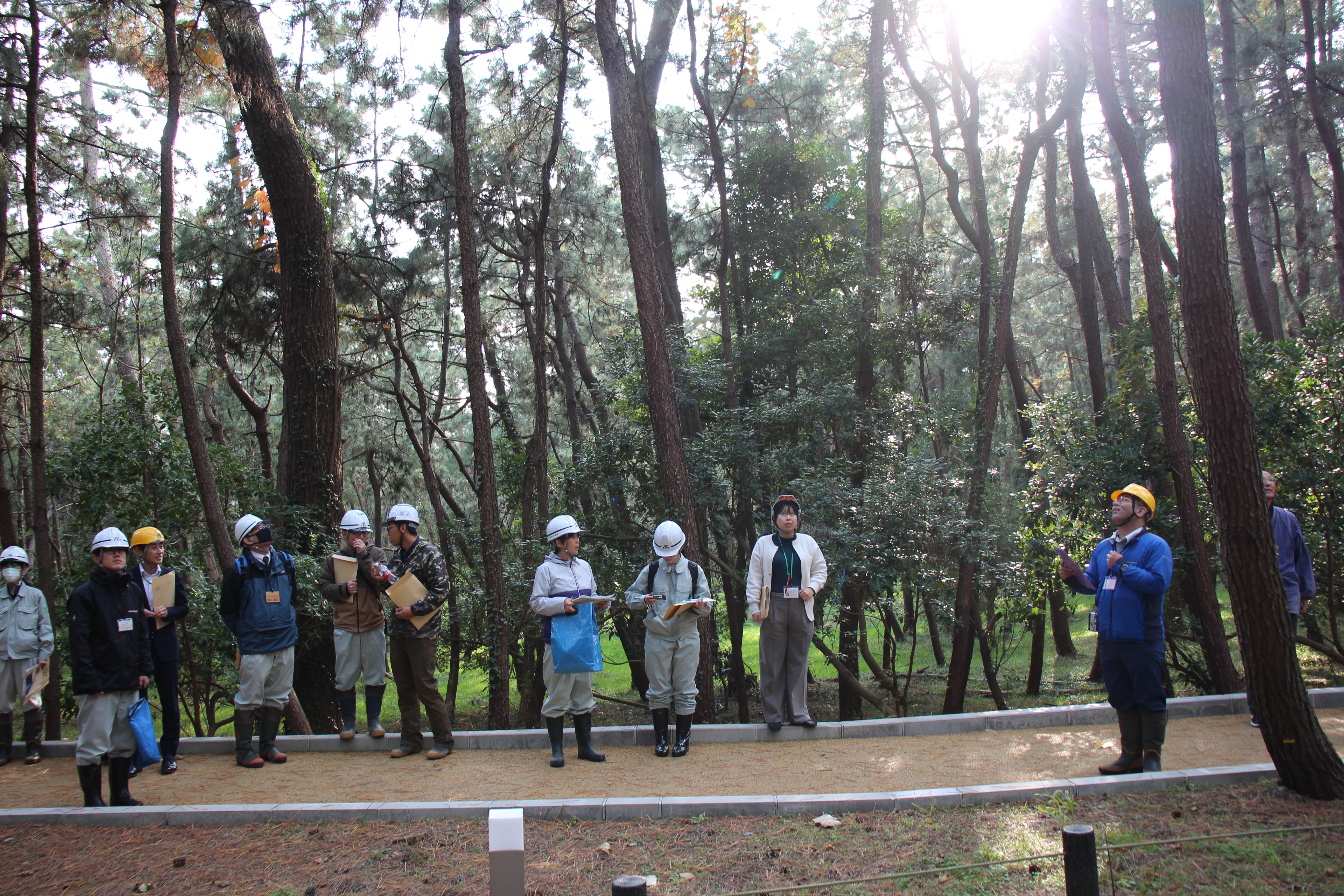 今回開催した現地検討会は、5つのブロックに分けて検討会を進めていき、まず、白砂青松の薬剤効果が高いブロック、植栽箇所と未植栽箇所の対比エリアブロックを参加者へ案内しました。