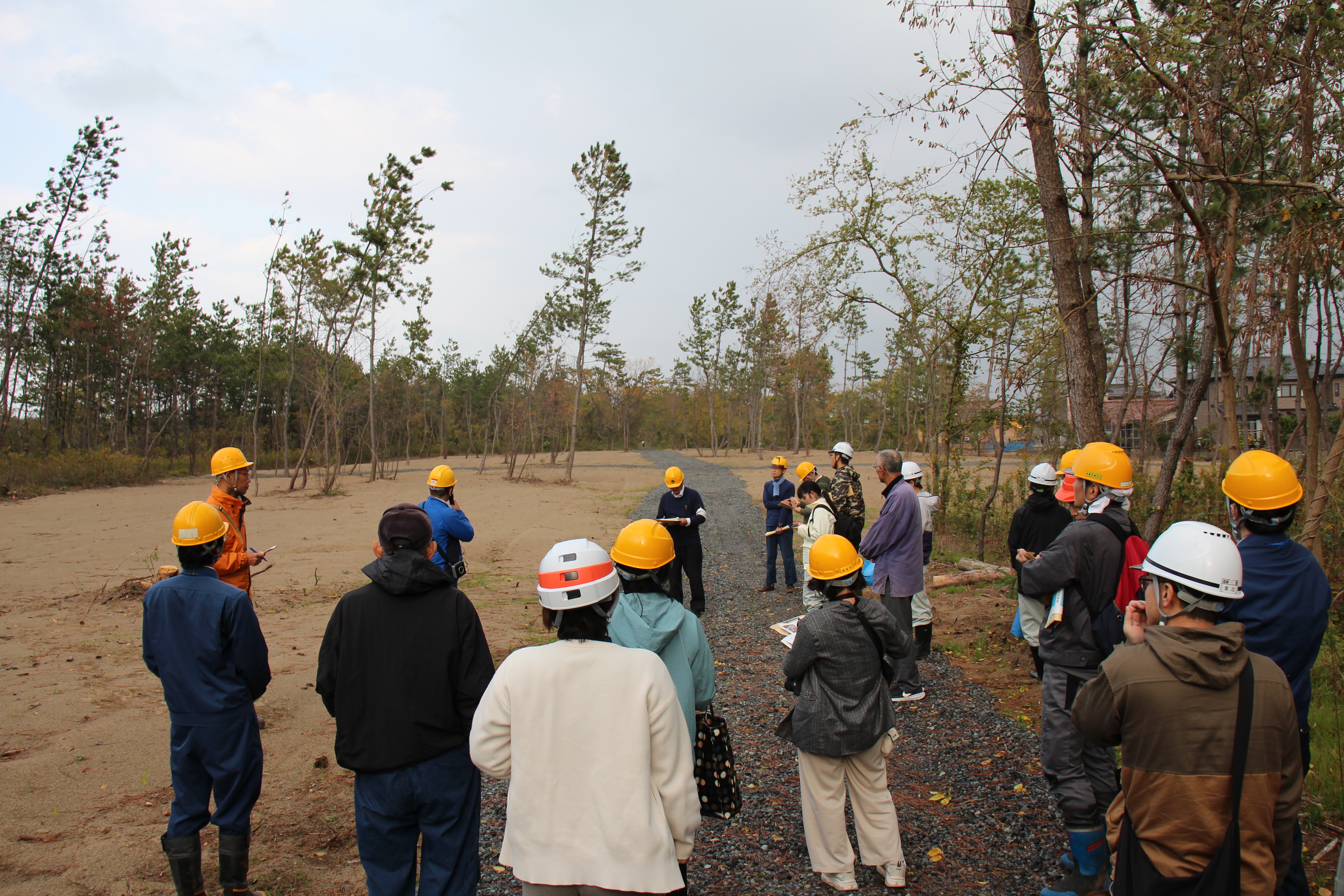 次に、今年度地かきを実施し更新を予定しているエリアへ案内しました。生存しているマツを母樹として天然更新を見据え、更新が不確実な場合、植栽を考えているエリアであることを説明しました。母樹となるマツの数が少ないことからマツの天然更新が困難ではないか、海岸線から離れているため広葉樹の植栽も適しているとの提言がありました。地かき箇所も新たな作業道を新設し、いくつかの新たな地かきブロックが発生したことから、今後、ブロック毎に複数の樹種を植栽してはどうかとの意見が出されました。参加者からは、マツを見て育ってきたので、マツを復元してほしいとの意見もいただきました。