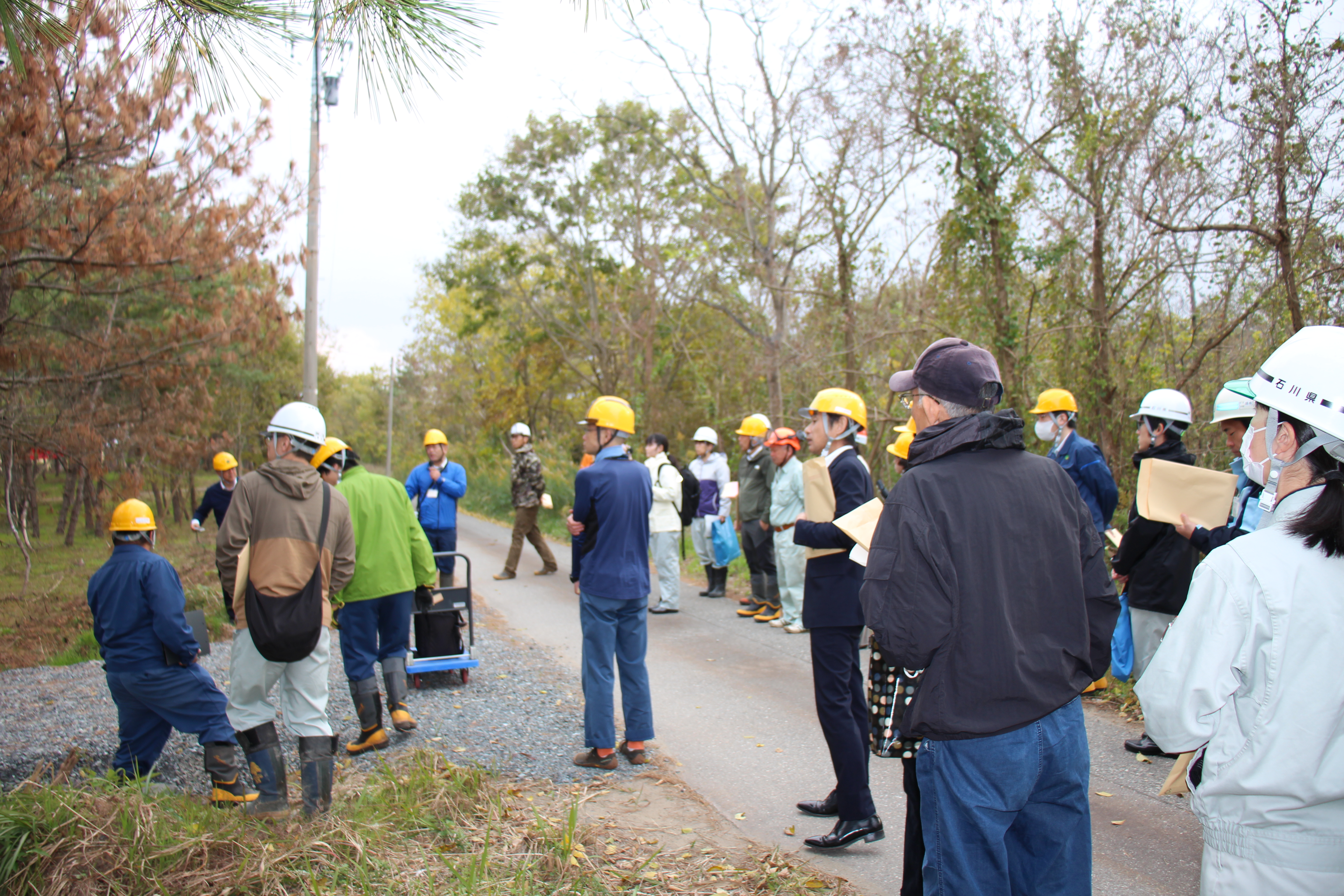 その後、意見交換を行うブロックへ進み、被害が著しいエリアへ到着しました。この場所は、遠方から目立つほどマツ枯れが拡大しており、被害木を駆除した後いかに施業を行うか検討会の主題である駆除跡地について、意見交換を行いました。被害を受けた抵抗性マツについて、参加者からは、抵抗性マツは被害を受けにくいが絶対枯れないということではないこと、道路からの距離により薬剤散布の効果について違いがあること、樹種転換の考え等についての意見がありました。