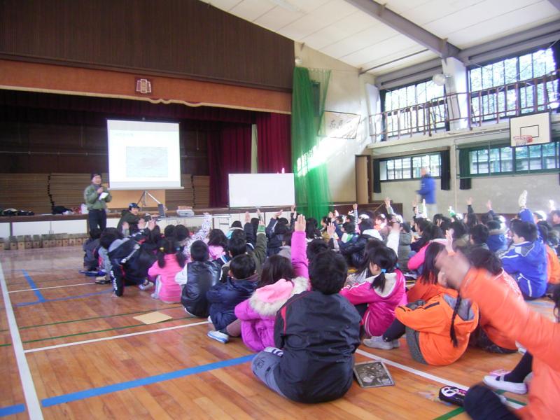 当日は、まず、金閣小学校の体育館において、当所の髙山流域管理調整官から開会の挨拶を述べた後、森林インストラクターの鳥越氏並びに磯野氏から野鳥の特徴や役割などについて、パワーポイントを使って児童に解りやすく説明が行われました。